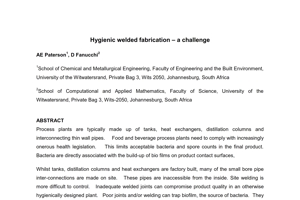 Process plants are typically made up of tanks, heat exchangers, distillation columns and interconnecting thin wall pipes. Food and beverage process plants need to comply with increasingly onerous health legislation. This limits acceptable bacteria and spore counts in the final product. Bacteria are directly associated with the build-up of bio films on product contact surfaces,