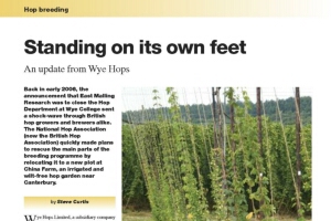 Back in early 2006, the announcement that East Malling Research was to close the Hop Department at Wye College sent a shock-wave through British hop growers and brewers alike. The National Hop Association (now the British Hop Association) quickly made plans to rescue the main parts of the breeding programme by relocating it to a new plot at China Farm, an irrigated and wilt-free hop garden near Canterbury.