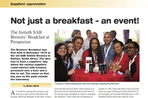 The Brewers’ Breakfast was first held in November 1974 at the old SAB Umbilo Brewery in Durban, South Africa. The idea was to have a suppliers’ day, where the various suppliers could interact with brewery personnel over a beer and a bite to eat. The venue on that day was on the patio outside the laboratory.