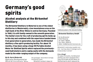 The Birkenhof Distillery in Nistertal is one of the oldest distilleries in Westerwald, a low mountainous area on the right bank of the River Rhine in central Germany. Founded in 1848, it is still family-owned in the seventh generation. The family’s love for the craft of producing spirits holds up to this day and combined with the experience handed down from generation to generation, has made the Birkenhof distillery a fine spirit-producing facility. For about 18 months, it has been using a Snap-50 Portable Alcohol Meter for Distilled Spirits which replaced the previouslyused hydrometers and is coping easily with the demands made by the wide-ranging output of the company.