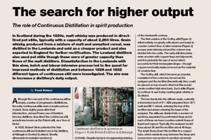 In Scotland during the 1820s, malt whisky was produced in directfired pot stills, typically with a capacity of about 2,250 litres. Grain whisky, produced from a mixture of malt and unmalted cereal, was distilled in the Lowlands and sold as a cheaper product and also exported to England for further rectification. The Lowland distillers also used pot stills though these were of greater capacity than those of the malt distillers. Dissatisfaction in the Lowlands with this slow, batch and labour-intensive process led to the quest for improved methods of distillation and between 1826 and 1832 different types of continuous still were investigated. The aim was to increase a distillery’s daily output.