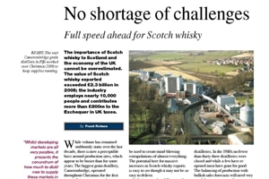 The importance of Scotch whisky to Scotland and the economy of the UK cannot be overestimated. The value of Scotch whisky exported exceeded £2.3 billion in 2005; the industry employs nearly 10,000 people and contributes more than £800m to the Exchequer in UK taxes.