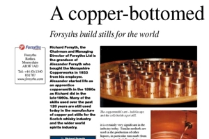 Richard Forsyth, the Chairman and Managing Director of Forsyths Ltd is the grandson of Alexander Forsyth who bought the Morayshire Copperworks in 1933 from his employer. Alexander started life as an apprentice coppersmith in the 1890s as Richard did in the late1960s. Many of the skills used over the past 120 years are still used today in the manufacture of copper pot stills for the Scotch whisky industry and the wider world spirits industry.