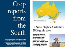 Correspondents from south of the Equator have kindly put together a series of reports on barley and hop harvests with took place between November last year and March 2007. Apart from the irrigated lands in northern South Africa and perhaps New Zealand, the constant thread running through is the lack of rainfall and we have an explanation of El Niño and the more benign La Niña which affect the climate around the southern oceans. Very little spare raw materials have been added to the world’s supplies and we now look to Europe and North America for a good harvest but will a dry warm April and a very wet mid May be able to deliver?