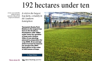 Tasmania’s Bushy Park Estates is the largest hop farm in the Southern Hemisphere with 192ha under some ten varieties of hops and a further 30ha of new planting planned in preparation for crop 2008. At an average yield of around 2.3 tonnes per hectare the 2007 yield will be in the order of 440 tonnes of hops.