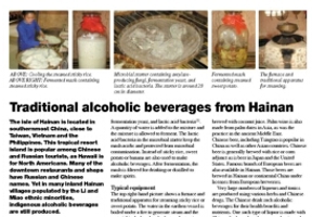 The isle of Hainan is located in southernmost China, close to Taiwan, Vietnam and the Philippines. This tropical resort island is popular among Chinese and Russian tourists, as Hawaii is for North Americans. Many of the downtown restaurants and shops have Russian and Chinese names. Yet in many inland Hainan villages populated by the Li and Miao ethnic minorities, indigenous alcoholic beverages are still produced.