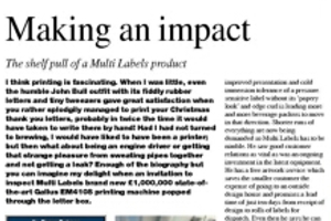 I think printing is fascinating. When I was little, even the humble John Bull outfit with its fiddly rubber letters and tiny tweezers gave great satisfaction when you rather splodgily managed to print your Christmas thank you letters, probably in twice the time it would have taken to write them by hand! Had I had not turned to brewing, I would have liked to have been a printer; but then what about being an engine driver or getting that strange pleasure from sweating pipes together and not getting a leak? Enough of the biography but you can imagine my delight when an invitation to inspect Multi Labels brand new £1,000,000 state-ofthe- art Gallus EM410S printing machine popped through the letter box.