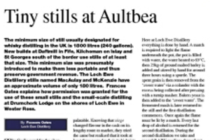 The minimum size of still usually designated for whisky distilling in the UK is 1800 litres (240 gallons). New builds at Daftmill in Fife, Kilchoman on Islay and St Georges south of the border use stills of at least that size. This minimum size was presumably introduced to make them less portable and thus preserve government revenue. The Loch Ewe Distillery stills named MacAulay and McKenzie have an approximate volume of only 180 litres. Frances Oates explains how permission was granted for the use of these small stills and the small-scale distilling at Drumchork Lodge on the shores of Loch Ewe in Wester Ross.