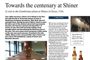 Your editor has been called a lot of things in his time but until his trip to Texas last autumn to look at Gambrinus Company operations, ‘Rain God’ was not amongst them. During my day at Shiner which is some 80 miles east of San Antonio about half way towards Houston, the heavens opened and deposited 1.3 inches of rain, thus well and truly ending a long drought which was threatening the third hay crop of the year. The area raises stock and grows a little maize so the rain was most welcome. Founded in the late 1880s, Shiner is the ‘cleanest little city in Texas’ and has only 2,100 inhabitants, mainly of Czech and Bavarian descent.